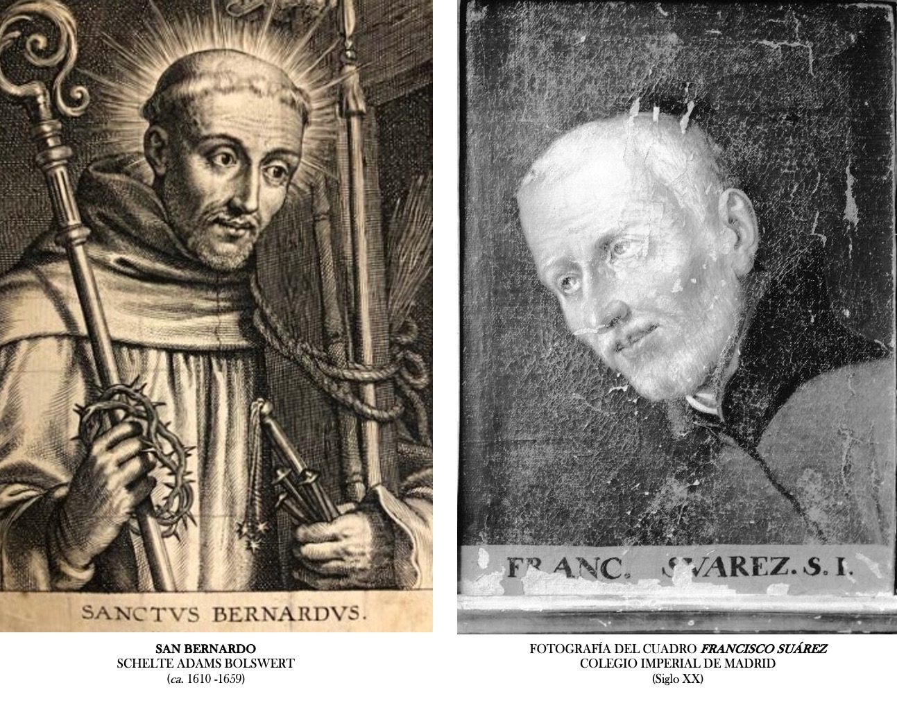 El arrebato místico de Suárez en su celda delante del crucifijo es el motivo iconográfico que recoge la recreación pictórica del siglo XX que, a partir de archivo fotográfico, se hizo del óleo del siglo XVII que hasta 1936 se encontraba en el Colegio Imperial de Madrid. Este cuadro, que Elorduy también deriva del modelo representativo del duque de Lerma, es el único que prescinde absolutamente de la faceta intelectual de Suárez. La estancia exenta de los objetos iconográficos habituales (librería, tinteros, plumas, bonete) deja solo al jesuita, que levita con los brazos en alto, frente al crucifijo, en una elaboración pictórica en la que se acentúa el carácter espiritual de Suárez, desvinculándolo de su labor teológica o filosófica. A pesar de que la composición toda y el rostro del jesuita se alejan de la mayoría de retratos en los que predomina la mirada circunspecta de Suárez, Elorduy sostiene que este cuadro, “desde un punto de vista psicológico” (1966: 64), concuerda más con las descripciones de los biógrafos y, por tanto, de los testimonios de quienes conocieron al granadino. Y como refuerzo iconográfico de su afirmación remite al parecido fisonómico que, según el relato biográfico de Sartolo, el jesuita Alonso Rodríguez, contemporáneo de Suárez, vio entre un cuadro de san Bernardo de Claraval y el jesuita. Las facciones, al parecer de Rodríguez, eran idénticas entre ambos y, con sólo cambiar el hábito, pasaría perfectamente uno por otro. El “prejuicio mismo o el rumor del parecido existente entre las facciones de Suárez y las de San Bernardo pudo influir en los artistas”, sugiere Elorduy, y esto permite especular que el cuadro del Colegio Imperial muestra un rostro más veraz y objetivo. El parecido entre la fotografía del óleo de Suárez y la imagen de la que está considerada como vera effigies de san Bernardo, así como otros retratos del santo, permite tomar en consideración la afirmación de Alonso Rodríguez. La imagen espiritual del jesuita, por lo demás, es la que se tomará como referencia en la creación de las estampas devocionales que se emitieron en los años cuarenta en el contexto de apertura de la causa de beatificación de Suárez.
