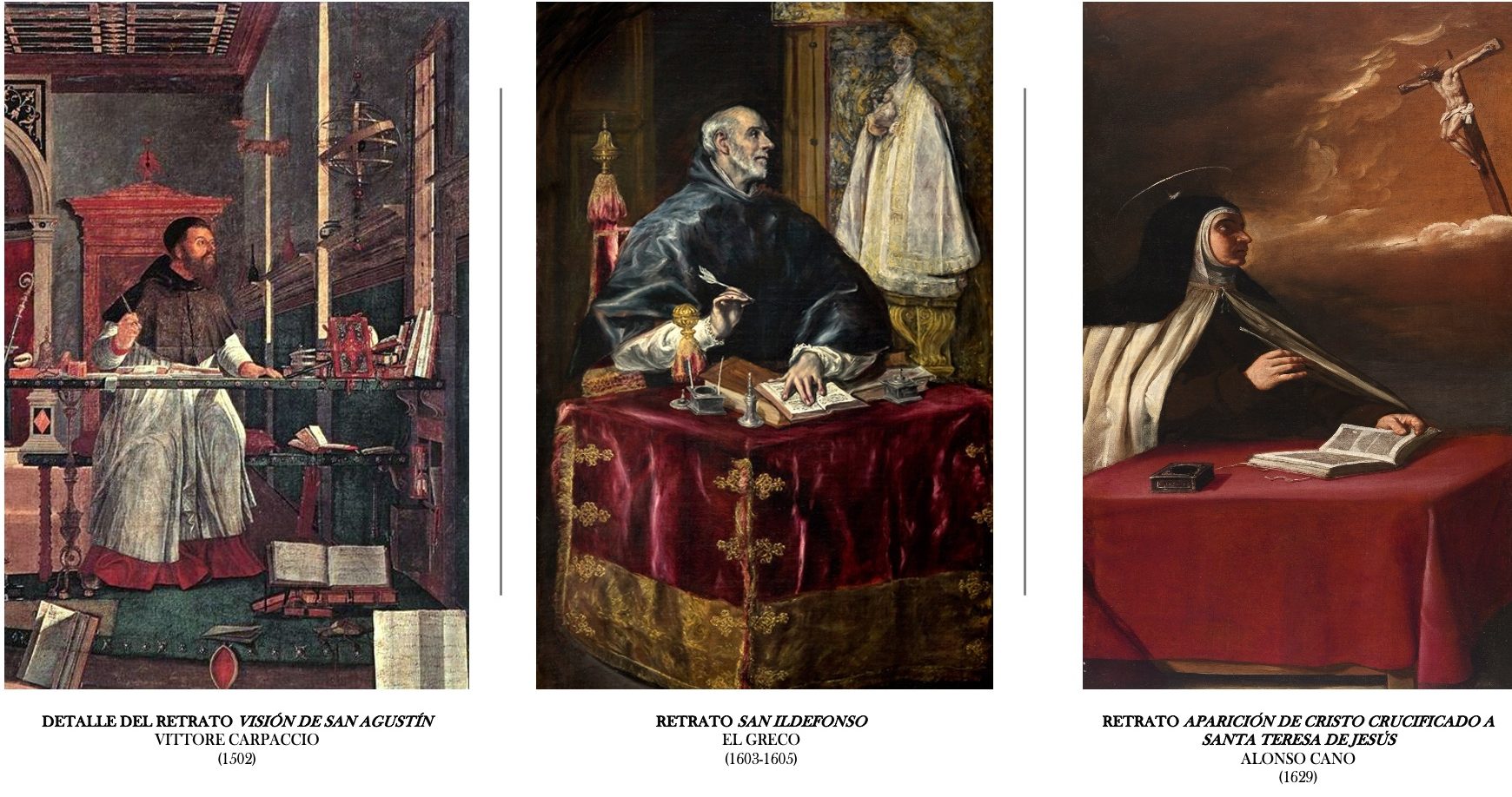El lienzo responde al modelo de retrato de escritor religioso, representando a Suárez con pluma en mano apoyada sobre el libro que está escribiendo, con mirada reflexiva en dirección al crucifijo y rodeado de una biblioteca que alberga su producción literaria. La deuda de este retrato con la pintura del Greco, evidente en la estilización del rostro del jesuita, informa también la propia composición del cuadro. Ha explicado Cécile Vincent-Cassy que “José Álvarez Lopera dijo con razón que esta pintura [San Ildefonso del Greco] inauguraba una nueva forma de representar a los Padres de la Iglesia, mostrados en el estudio, recibiendo inspiración. Ciertamente, esta iconografía ha sido explotada en numerosas composiciones pictóricas durante el siglo XVII para exaltar las figuras de los escritores religiosos, como San Gregorio Magno de Fray Juan Andrés Rizi (1645-1655), o Santa Teresa de Ávila de Alonso Cano, en la que se ve a la santa mística levantando la pluma del tintero mientras mira a Cristo en la cruz”[7]. Y, efectivamente, desde el precedente del san Agustín de Carpaccio, el Greco reproduce un modo compositivo también presente en su san Jerónimo, en Francisco de Pisa, e incluso en su retrato del Cardenal de Tavera a partir de la máscara mortuoria, y que es el que predomina en este lienzo y que, de diversas maneras, aparece en parte importante de los retratos conservados de Suárez.