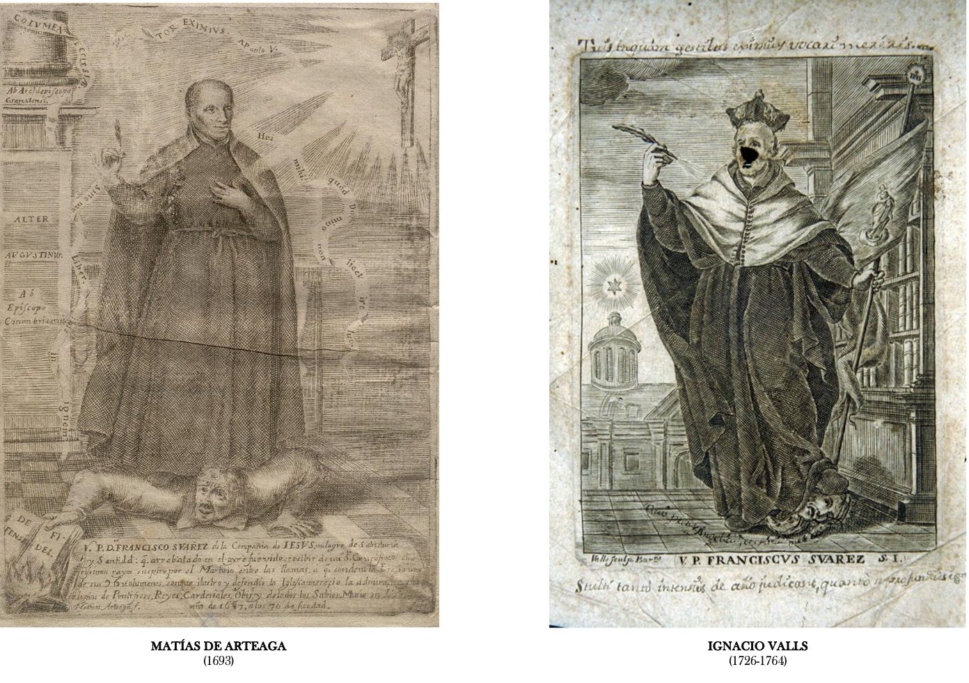 Alejados de la objetividad pictórica, se encuentran otros retratos con un marcado carácter idealizador. Son las pocas muestras que se tiene de la representación de momentos de la vida de Suárez con la voluntad de destacarlos como hechos extraordinarios. La estampa de Matías de Arteaga que ilustra la biografía de Sartolo (1693) destaca a Suárez sometiendo a Jacobo I gracias a su ciencia asistida por la luz de Cristo. La leyenda que acompaña la imagen del jesuita remite al relato biográfico del granadino al que un compañero de religión sorprendió en arrebato místico al entrar en su celda. La victoria de Suárez sobre el monarca inglés que mandara quemar públicamente su Defensio fidei, aquí representada en el ángulo inferior, remite iconográficamente a la imagen pictórica que, desde la Edad Media, se venía ofreciendo de la Inmaculada Concepción. La lectura simbólica del capítulo 12 del Apocalipsis permitía representar la victoria de la Virgen sobre el pecado con su pie sobre la serpiente, que a veces también era retratada con cabeza humana. Esta idea la recoge y lleva a un nivel de exaltación Ignacio Valls (1726-1764) en uno de los dos grabados que realiza del jesuita. Suárez es investido con galas académicas, como portaestandarte jesuita de la Inmaculada, con la pluma en mano, y aplastando la cabeza de Jacobo I., en un espacio que es el de su estudio, y dejando en la otra mitad lugar para la idealización simbólica de la estrella como signo del designio divino reservado para Suárez como luz y guía de la Iglesia.