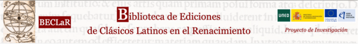La Biblioteca de Ediciones de Clásicos Latinos en Renacimiento, con más de una década de andadura, es un Proyecto de Investigación radicado en la Universidad Nacional de Educación a Distancia (UNED) y dirigido por Antonio Moreno Hernández, Catedrático de Filología Latina. El grupo de investigadores de BECLaR es interdisciplinar y está integrado por profesores de filología y bibliotecarios especialistas en fondo antiguo.