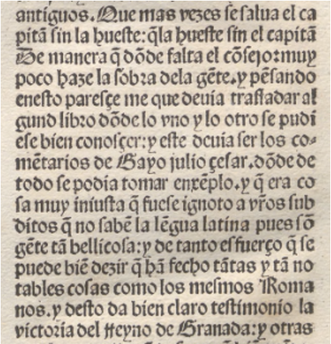 Por último, en el periodo incunable, la traducción del corpus cesariano, obra de Diego López de Toledo, primera estampada en lengua vulgar, está dedicada al príncipe Juan[11]. Se trata de la primera ocasión en la que, en nuestro corpus, encontramos un prólogo que es autoría del propio traductor y que fue elaborado para ser impreso.