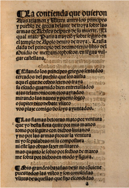 La poesía épica de Ovidio, las Metamorfosis, fue impresa en castellano primero en una selección de versos: nos referimos a la traducción parcial realizada por Alonso Rodríguez de Tudela, impresa en una sola ocasión, en Valladolid en 1519 (CECLE0124). Con el título «La contienda que ovieron Ajas Telamon y Ulixes antes los principes y pueblo de Grecia delante de Troya sobre las armas de Achiles despues de su muerte», esta edición transmite la traducción de met. 13 1-398 en un total de 76 octavas, estampadas en un pliego suelto. Esta traducción se ha conservado encuadernada a continuación de la Ilias Latina de Juan de Mena en los dos testimonios que han llegado a nuestros días. La siguiente figura corresponde a h. a1r del ejemplar conservado en la Biblioteca Nacional de Viena con la signatura BE.8.S.76 Alt-Prunk (CECLE0124-112a).
