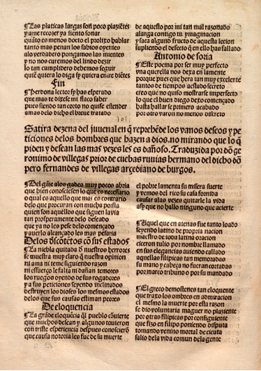 La sátira, género genuinamente romano, tuvo una breve aparición en castellano en el siglo XVI: la décima sátira de Juvenal, en traducción de Jerónimo Fernández de Villegas, vio la luz en Burgos en 1515 (CECLE0122). La misma traducción, con modificaciones menores, se reproduce en la edición de Valladolid 1519 (CECLE0155). Esta sátira se transmitió junto a su traducción de la obra de Dante, del mismo Fernández de Villegas[16]. En la siguiente figura puede verse el inicio de la traducción, en h. Q2v, tomado del ejemplar conservado en la Biblioteca de Cataluña con signatura Bon. 7-VI-20 (CECLE0122-071a). Las sátiras en español no pudieron encontrar un espacio mayor en unas décadas en las que, poco a poco, se iba atisbando la censura que se codificaría legalmente en la segunda mitad del XVI.