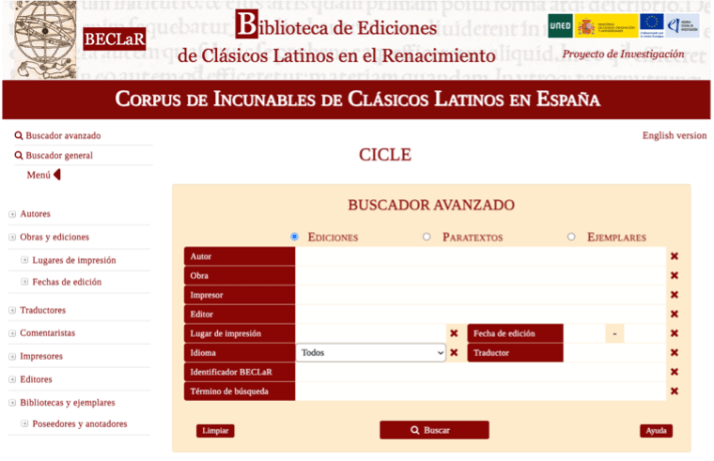 Actualmente está en desarrollo la segunda parte de CECLE, que incluye el estudio de las ediciones impresas de 1551 a 1600. Tanto en CICLE como en CECLE, la información se estructura en torno a tres categorías principales: ediciones, paratextos y ejemplares. El buscador avanzado, en el que es posible establecer y combinar diferentes criterios de búsqueda, arroja resultados articulados en torno a estas tres categorías. En relación con las traducciones, el buscador avanzado dispone de dos campos de búsqueda específicos: “idioma” (latín, español, catalán y texto latino con traducción) y “traductor”.