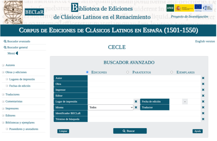 [2] Semanalmente, un grupo de investigadores de BECLaR se reúne para continuar corrigiendo y ampliando los contenidos publicados en sendas bases de datos. Son Nuria García (BNE), Daniel Río Lago, Elvira Rodríguez, Rocío Giménez, Irene Villarroel, Manuel Ayuso y Antonio Moreno, investigadores de la UNED. A todos ellos agradezco su trabajo y su ayuda.