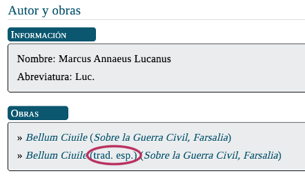 En BECLaR, para discernir con claridad las entradas de textos traducidos, el título de la obra latina se presenta seguido de la abreviatura de la lengua en la que se ha estampado, «trad. esp.» para las traducciones castellanas. Así, se facilita la identificación de las traducciones entre los resultados de cualquier búsqueda, sea cual sea el criterio que hayamos seleccionado para el rastreo. Esta identificación facilita también la interpretación de la información en las tablas de autores, obras y ediciones.