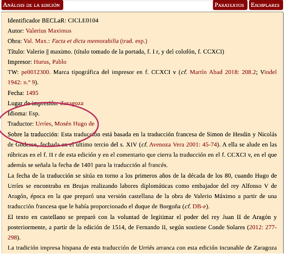 Dentro de la ficha de cada edición, se incorporan dos campos específicos en aquellas que transmiten textos en romance: «traductor» y «sobre la traducción». En este espacio se da cuenta de la información disponible acerca de la autoría, datación, fuentes y características de la traducción.