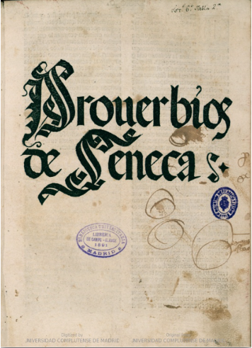 La traducción conocida como Proverbios de Séneca es obra de Pedro Díaz de Toledo y fue elaborada por encomienda de Juan II[3]. En la figura puede verse la portada tipográfica[4] (h. A1r) del ejemplar de Sevilla 1495, conservado en la Biblioteca Histórica Marqués de Valdecilla con la signatura BH INC FL-119 (CECLE0088-091a).